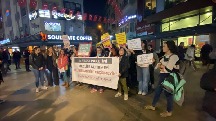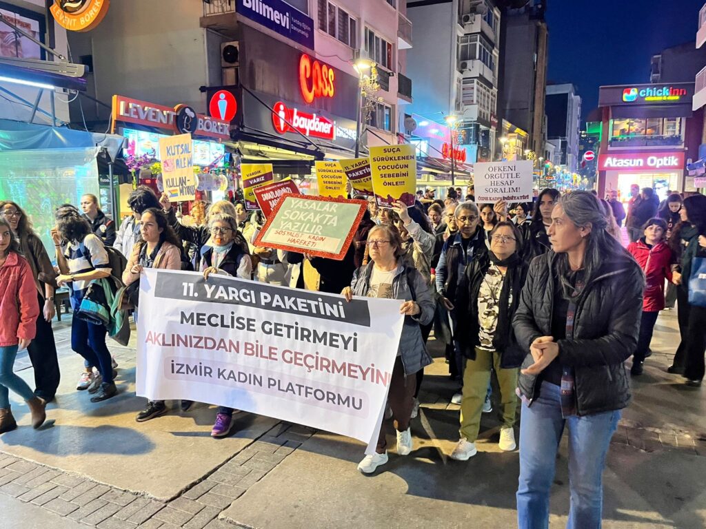11. yargı paketine karşı İzmir Kadın Platformu eylem düzenledi. Bugün saat 18.30’da Alsancak ÖSYM binası önünde “11. yargı paketini Meclis’e getirmeyi aklınızdan bile geçirmeyin” yazılı pankartın ardında toplanan grup, alkışlar ve sloganlar eşliğinde Türkan Saylan Kültür Merkezi önüne yürüdü, burada basın açıklaması okundu.