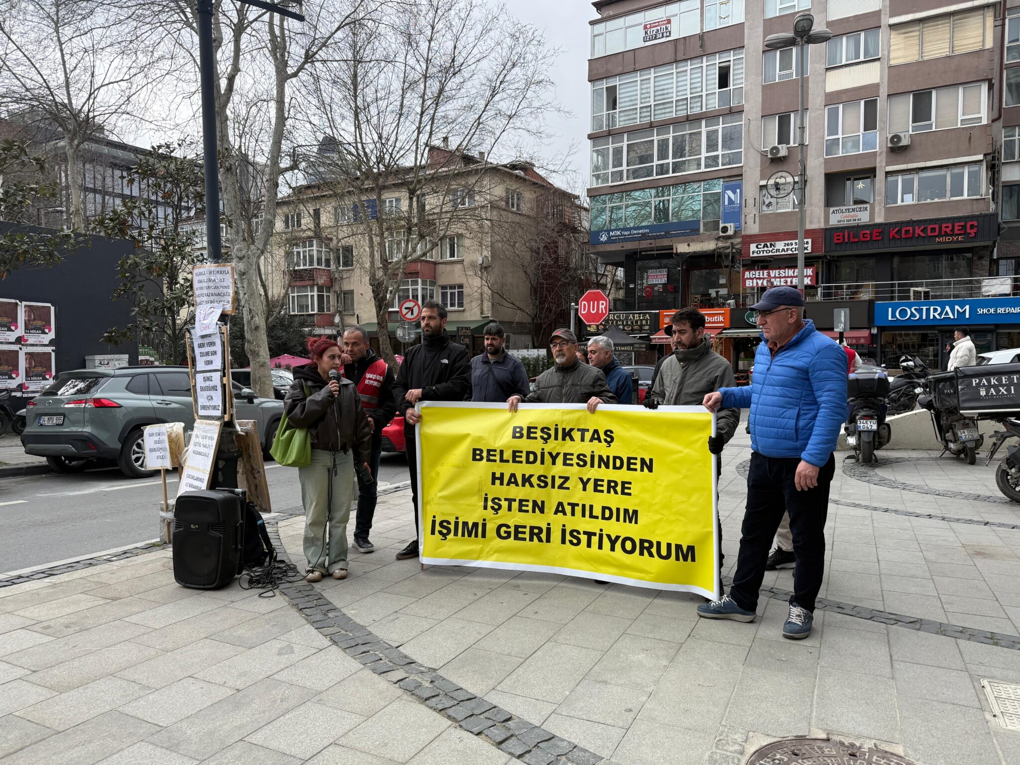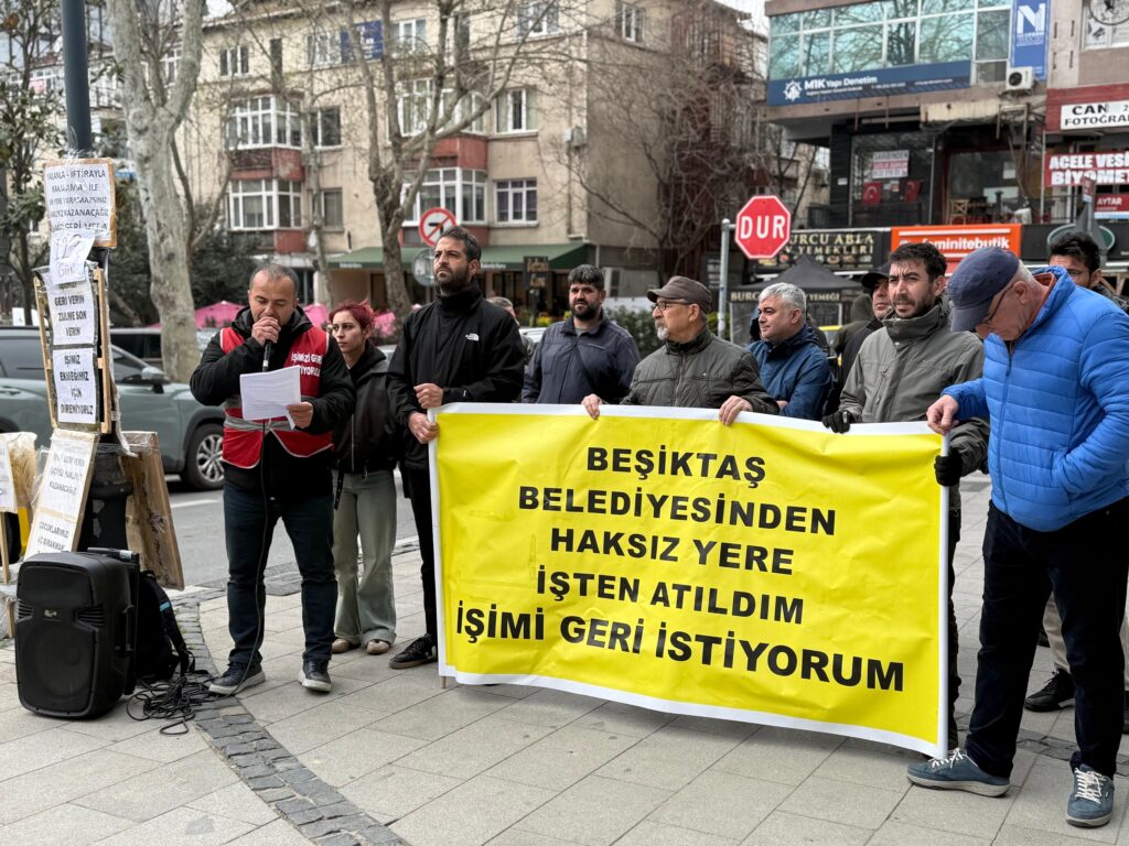 Saat 16:30’da gerçekleşen açıklamada, “Beşiktaş Belediyesi’nden Haksız Yere İşten Atıldım İşimi Geri İstiyorum” pankartı taşındı.