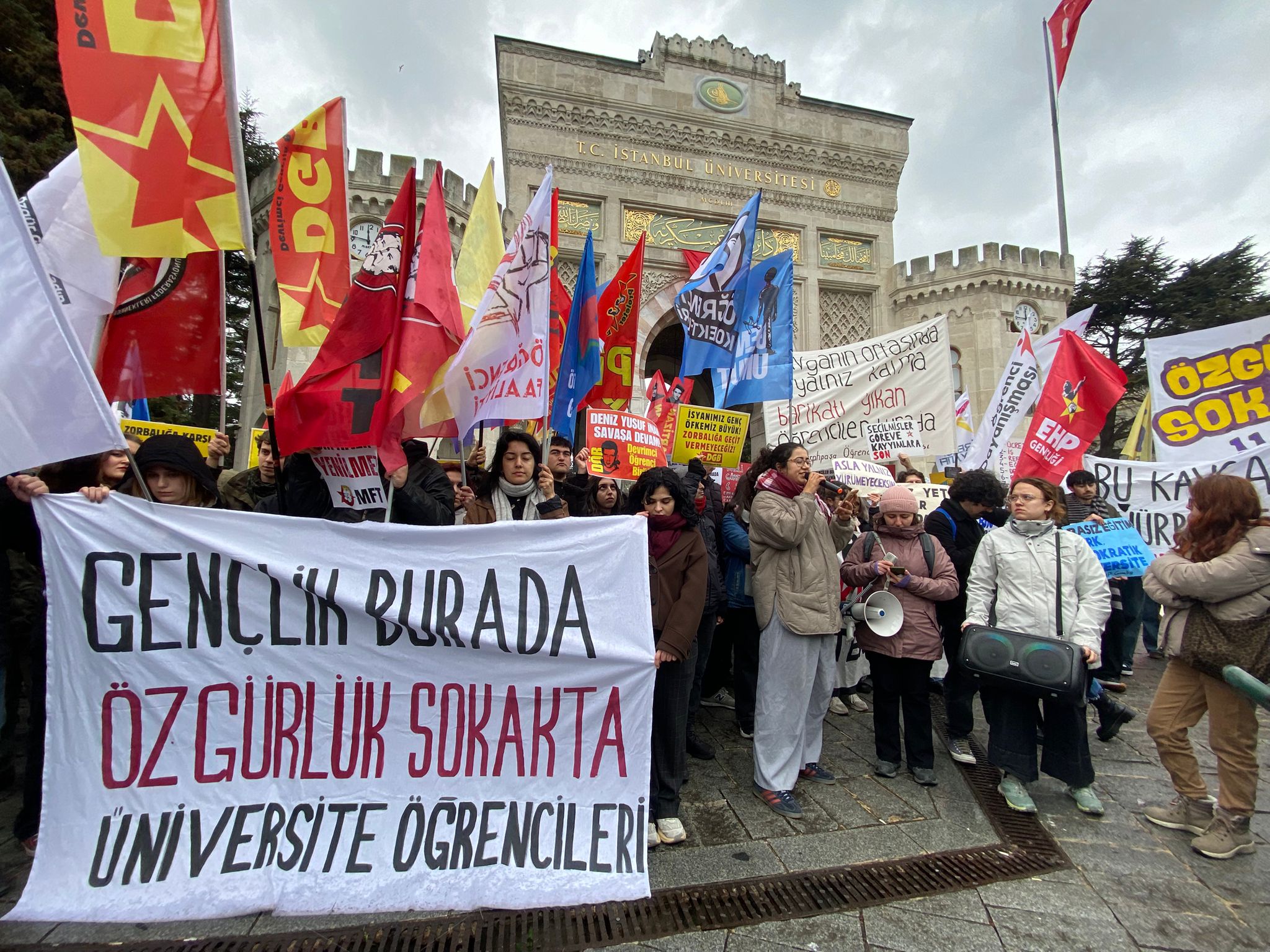 Üniversite öğrencilerinin çağrısıyla 19 Mart’ın yıldönümünde kitle saat 14.00’da İstanbul Üniversitesi Esnaf Yemekhanesi önünde bir araya geldi. “Gençlik burada, özgürlük sokakta” yazılı pankartın arkasında toplanan kitle Beyazıt Meydanı’na yürüyüşe geçti.