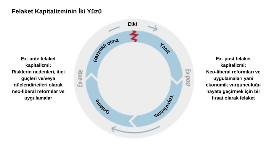 Felaket kapitalizmi tüm afet risk yönetimi aşamalarında gözlemlenebilir bir durum olarak karşımıza çıkıyor. Yani afetlerin öncesinde (ex-ante) ve sonrasında (ex-post) gerçekleşen süreçler söz konusudur.