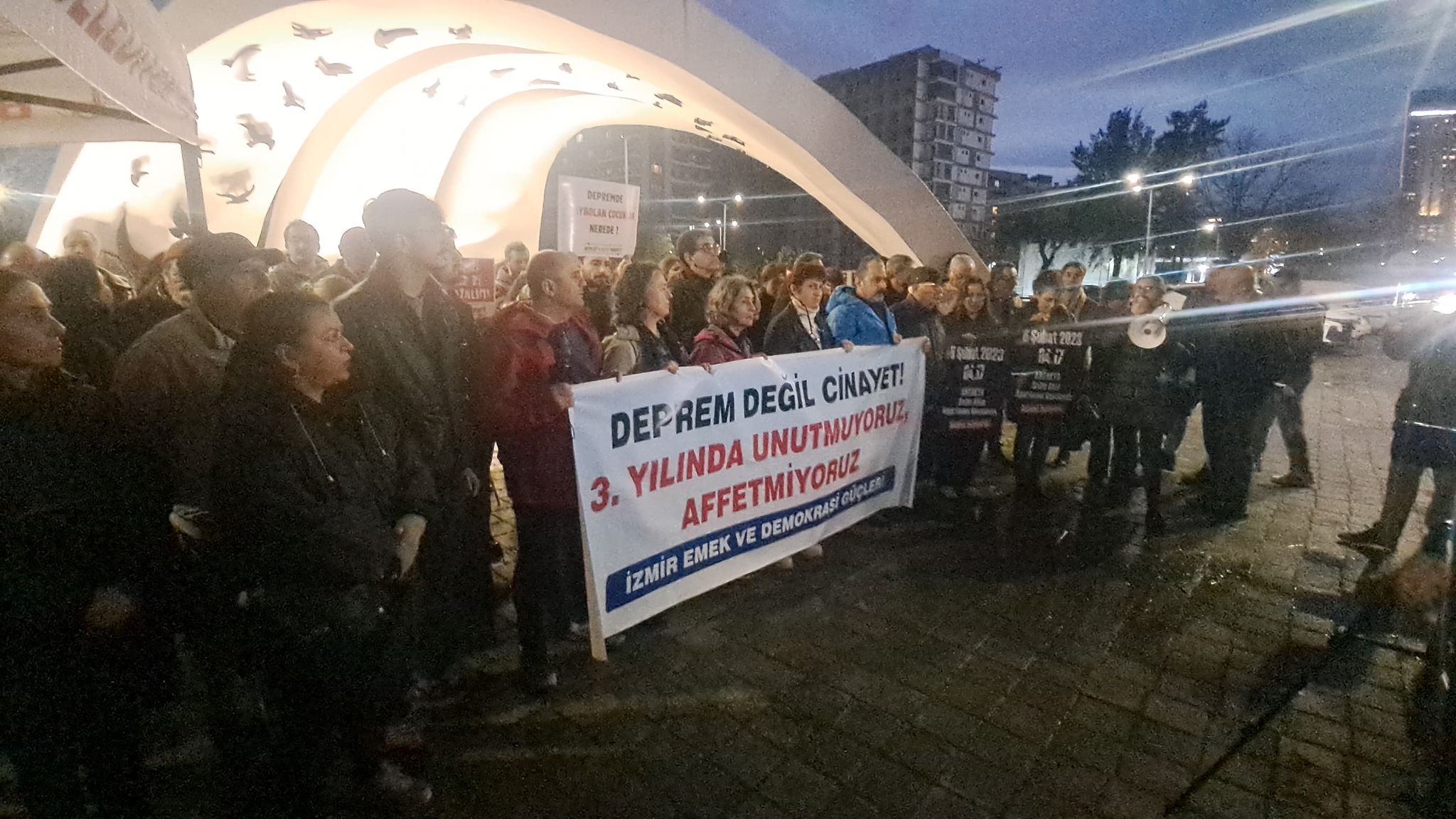 İzmir’de Emek ve Demokrasi Güçleri’nin çağrısıyla 6 Şubat depremi anması gerçekleşti. Bugün saat 19.00’da Bayraklı Deprem Anıtı önünde “Deprem değil cinayet! 3. yılında unutmuyoruz, affetmiyoruz” yazılı pankart önünde toplanıldı. Burada basın açıklaması okundu.