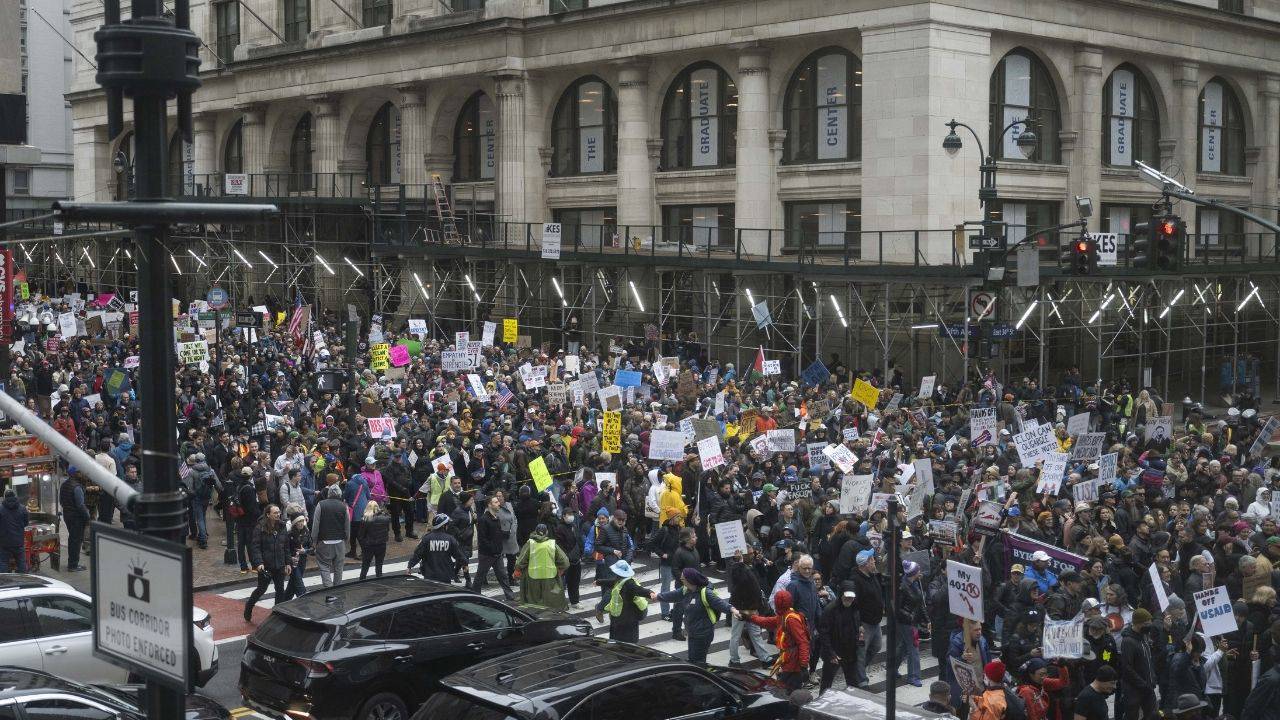New York şehrinde başta Bryant Park olmak üzere değişik noktalarda binlerce gösterici yer yer yağan şiddetli yağmura rağmen meydanları doldurarak Trump yönetimini protesto etti.