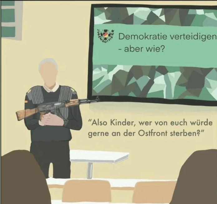 Olay, Alman Ordusu’na bağlı bir gençlik subayının okul ziyareti sırasında yaşandı. Subayın “Demokrasiyi savunmak – ama nasıl?” başlıklı sunumunun ardından öğrenci, Instagram hesabında, subayı elinde tüfekle sınıfın önünde gösteren bir karikatür paylaştı. Görselde, şu cümle yer alıyordu: “Peki çocuklar, aranızda kim doğu cephesinde ölmeyi ister?”