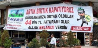 Elektrik faturasına isyan ederek “hırsız var” diye pankart asan esnaf ifadeye...