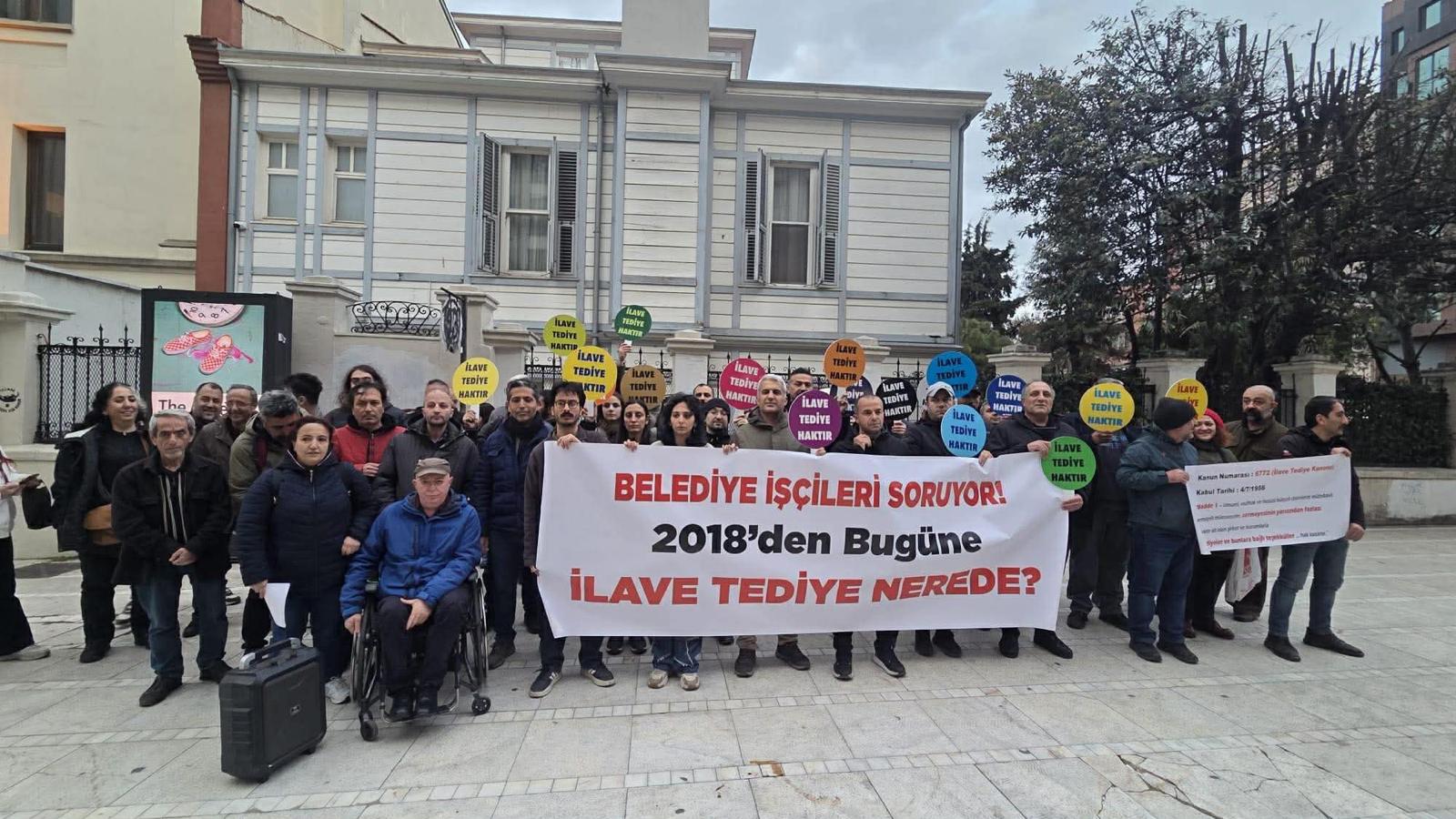Yaklaşık 700 bin belediye işçisi kamu emekçisi olduğu halde kamu çalışanlarının sahip olduğu temel haklardan yararlanamıyor. Kamu işçilerine her yıl verilen 52 günlük yevmiye tutarındaki tediye ödemesi belediye işçilerine yılardır ödenmiyor. Bu hakları için davalar açan, Çalışma ve Sosyal Güvenlik Bakanlığı’nı sorumlu davranmaya çağıran işçiler eylemler yaparak ses yükseltmeye çalışıyor.