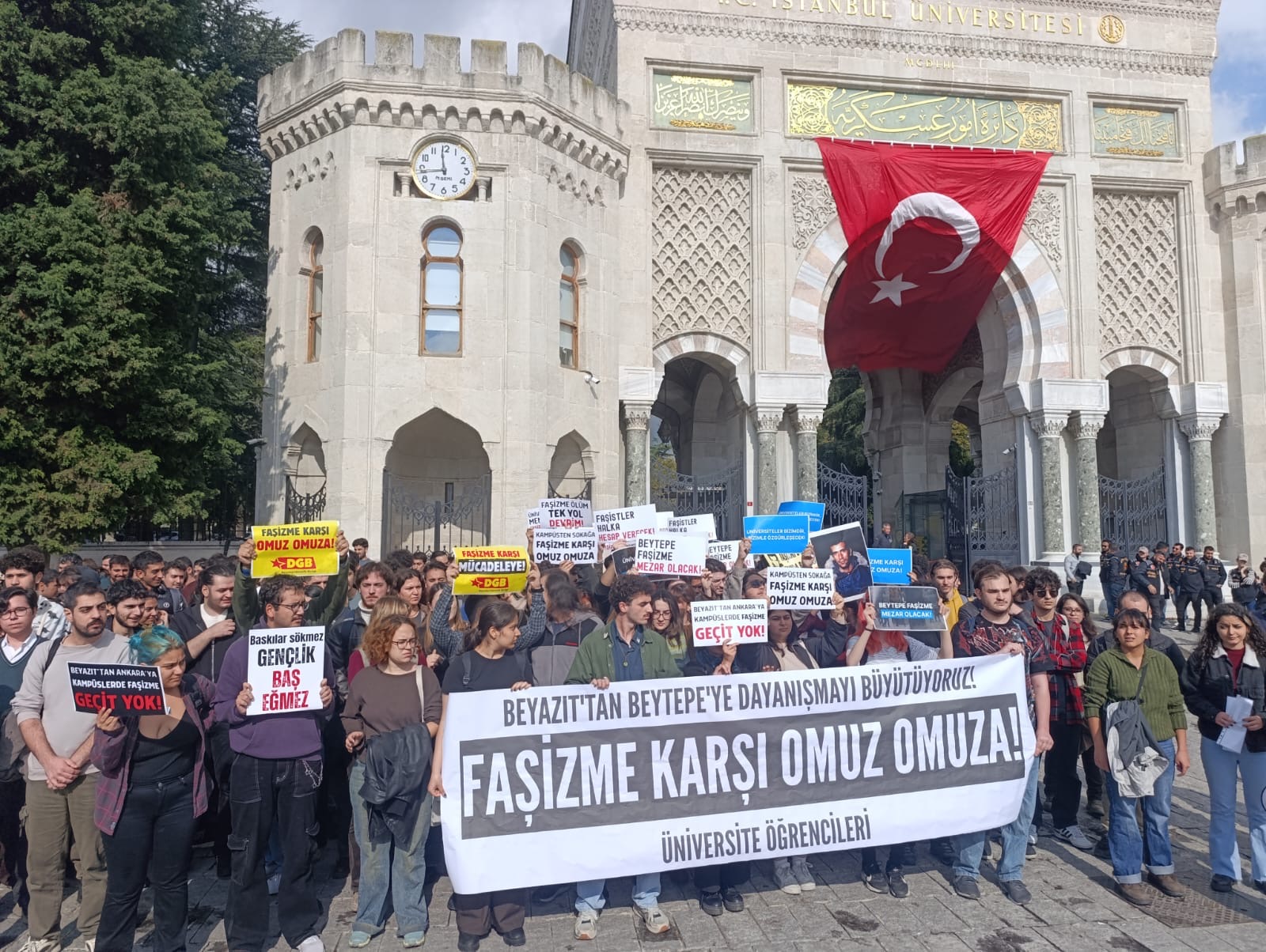 Dün Hacettepe Üniversitesi içerisinde faşist çetelerin pala ve kesici silahlarla öğrencilere saldırmasının ardından Üniversite Öğrencileri Beyazıt Meydanı’na basın açıklaması çağrısı yaptı. 12.00’da başlayan eyleme başta İstanbul Üniversitesi öğrencileri olmak üzere çeşitli üniversiteler ve sosyalist gruplar katılım gösterdi.