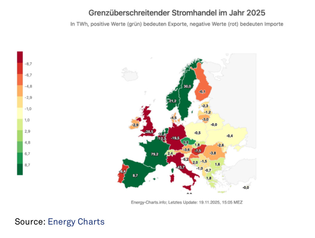 Büyük miktarda elektrik enerjisi sağlama kabiliyetini stratejik kaynaklarımız arasına dahil etmeliyiz. Bu, sadece tedarik endüstrisinin ve nüfusun elektriğe erişebilmesi anlamına gelmez. Burada odak noktamız, geleneksel endüstri çerçevesi dışındaki her tür veri merkezidir. Özellikle yapay zekâ gibi, ciddi miktarda elektrik enerjisi tüketen endüstrilerin ekonomisine odaklanıyoruz. Ayrıca, Batı bir bütün olarak Çin’le karşılaştırıldığında çok dezavantajlı bir pozisyondadır. Almanya, tüm nükleer santrallerini kapatıp sökerek ve neredeyse dini bir coşkuyla güneş enerjisine geçiş yaparak, sanayileşmiş bir ülke için kendini savunulamaz bir konuma getirdi Aşağıdaki grafik, bunun 2025 yılının günlük ihraç ve ithal hacimlerine bağlılığı gösterir.
