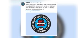 Tüm Taşıma İşçileri Sendikası (TÜMTİS) sosyal medyadan yaptığı paylaşımla, Yemek Sepeti Manisa deposunda işten çıkarılan 3 işçi için mahkemenin işe dönüşe ve...