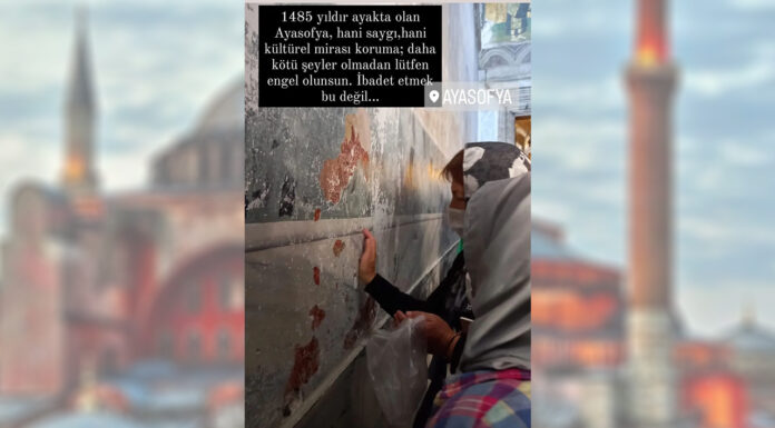 Camiye dönüştürülen Ayasofya’da ziyaretçiler duvarları kazıyıp poşete dolduruyor, parça koparıp ağızlarına atıyorlar