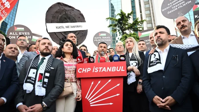 CHP İstanbul İl Başkanlığı, İsrail’in uyguladığı soykırım saldırısına karşı İsrail’in İstanbul Başkonsolosluğu önünde eylem düzenledi. Beşiktaş Barbaros Hayrettin Paşa Camisi önünde toplanan kalabalık, kortej halinde konsolosluk binasının önüne yürüdü.