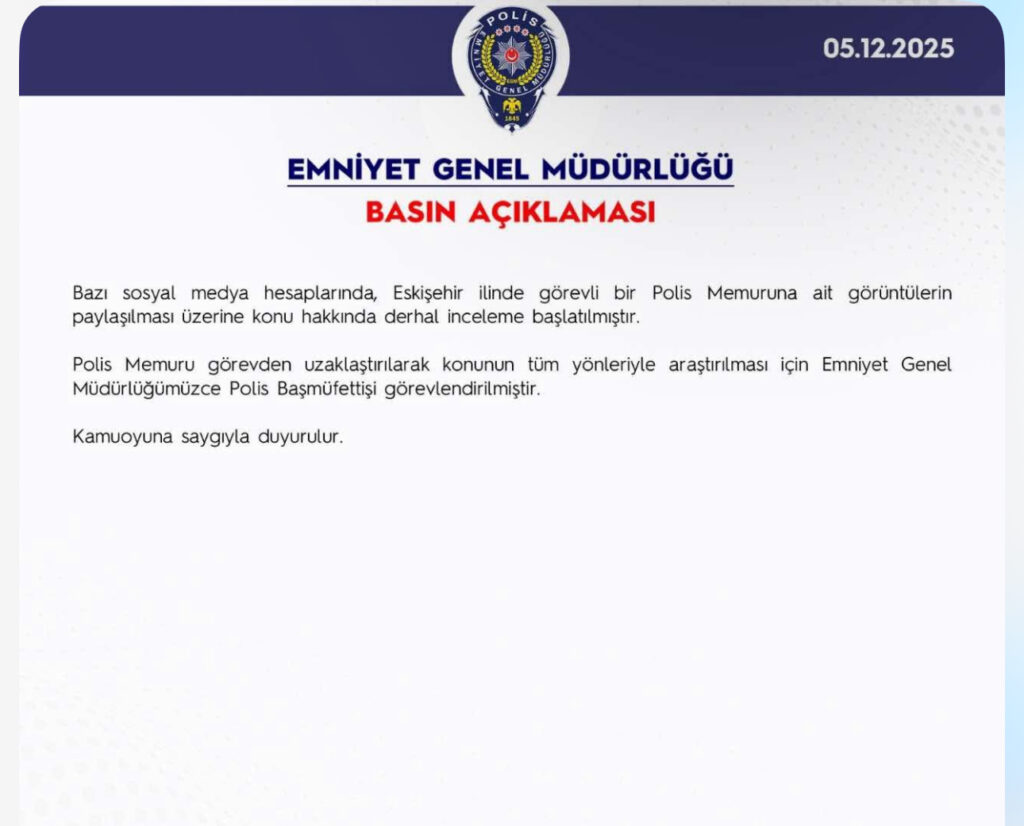 Söz konusu video sosyal medyada yayılınca, Emniyet Genel Müdürlüğü’nden yazılı açıklama yapıldı. Yapılan açıklamada “Bazı sosyal medya hesaplarında, Eskişehir ilinde görevli bir Polis Memuruna ait görüntülerin paylaşılması üzerine konu hakkında derhal inceleme başlatılmıştır. Polis Memuru görevden uzaklaştırılarak konunun tüm yönleriyle araştırılması için Emniyet Genel Müdürlüğümüzce Polis Başmüfettişi görevlendirilmiştir. Kamuoyuna saygıyla duyurulur.” denildi.