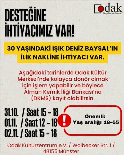 Cuntaya karşı direnişi örgütlemek için giriştiği bir eylemde hayatını kaybeden yoldaşımız Metin Adil Toraman’ın, Almanya’da yaşayan ve maalesef genç yaşta kanserle mücadele etmek zorunda kalan yeğeni Işık Deniz Baysal için Odak Kültür Merkezi olarak donör bulma etkinliği düzenledik.