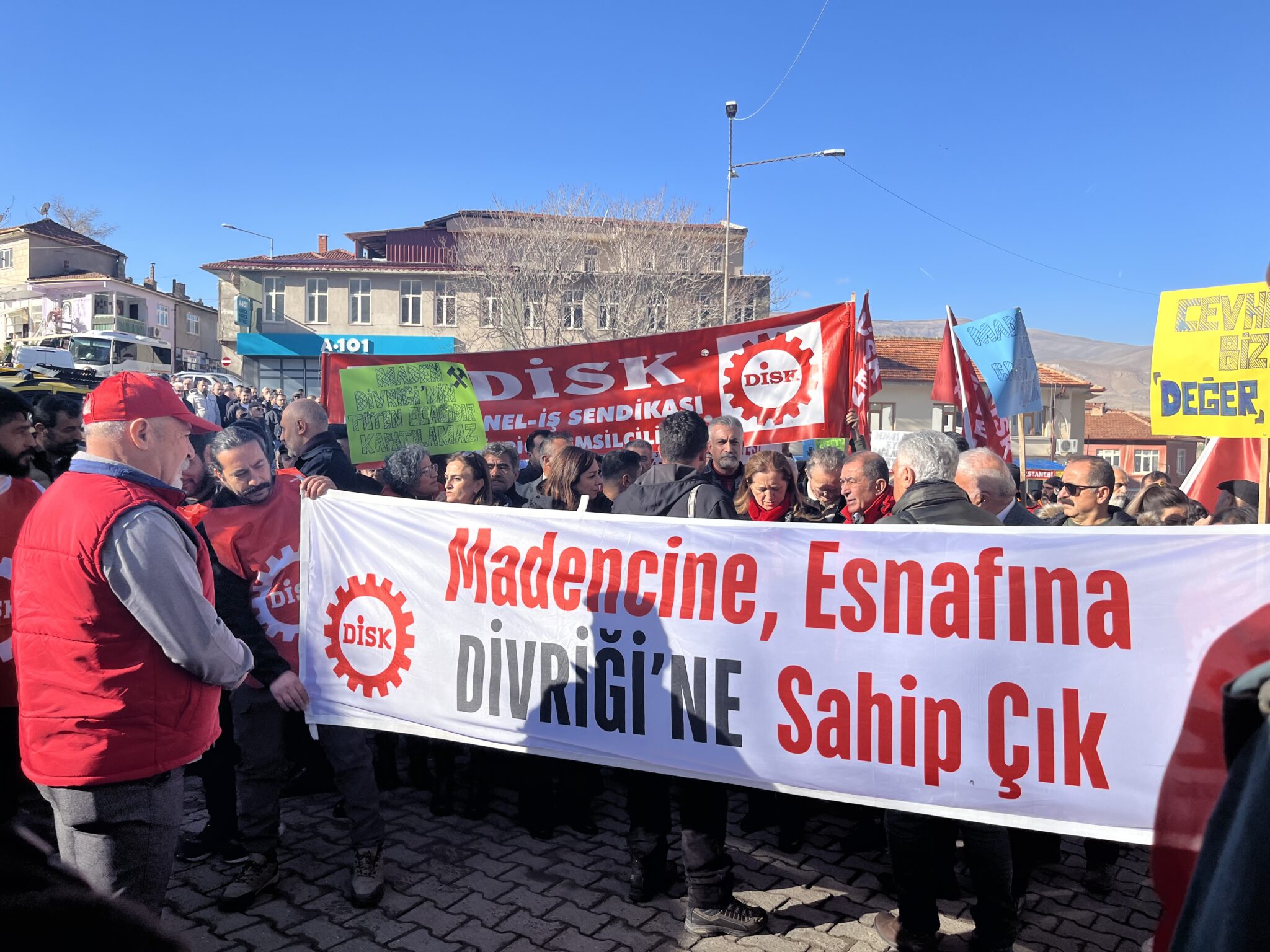 Sivas’a bağlı olan Divriği ilçesinde maden sahalarının kapatılması ve işten çıkarmalara karşı 18 gündür direnişte olan DİSK / Dev Maden-Sen üyesi işçiler Cumhuriyet Meydanı’nda yürüyüş gerçekleştirdi. DİSK Genel Başkanı Arzu Çerkezoğlu ve Divriği Belediye Başkanı Cihan Demir Akbaş’ın da katıldığı yürüyüşte, katılımcılar Oyak Holdinge bağlı olan Erdemir ve Ermaden şirketlerini protesto ettiler. Yürüyüş sırasında “Zafer direnen emekçinin olacak” “Direne direne kazanacağız” gibi sloganlar atıldı ve yürüyüşün ardından meydanda açıklama gerçekleştirildi.