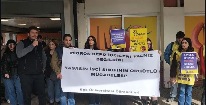 “Tuncay Özilhan ve Migros yönetimi bilsin ki; ters kelepçelerle, polis barikatlarıyla sindirmeye çalıştığınız o işçilerin arkasında sadece sendikaları değil, üniversiteli gençler de var. İşçiler açken patronlara huzur vermeyen o kararlılık, bugün Ege Üniversitesi kampüsünden ses veriyor.