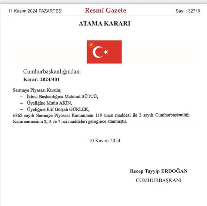Yayımlanan karara göre SPK İkinci Başkanlığına Mahmut Sütcü, Üyeliğine ise Mutlu Akın ve Elif Gülşah Gürlek atandı.
