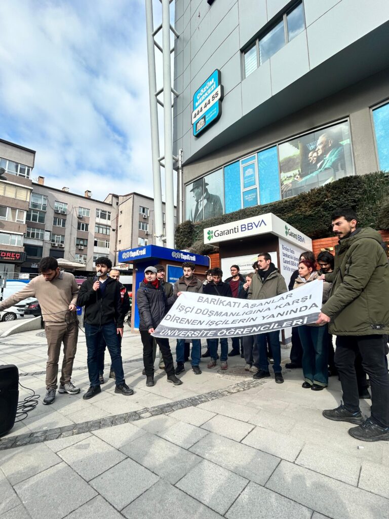 “Barikatı Aşanlar, İşçi Düşmanlığına Karşı Direnen İşçilerin Yanında” pankartıyla bir araya gelen üniversite öğrencileri, bir an önce Rasim Şişman’ın bu tutumundan vazgeçmesi gerektiğini ve Turan Çil’in bu mağduriyetinin bir an önce giderilmesini talep etti.