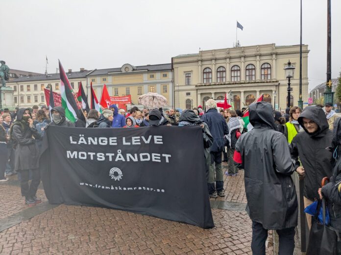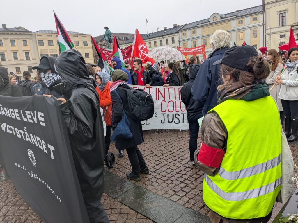 Bugün (7 Ekim 2025) saat 17.00’da, hafta içi olmasına ve yağışa rağmen, Gustav Adolfs Torg’da toplanan 300 kişiyi aşkın kitle Götaplatsen’a doğru Filistin yanlısı ve İsrail karşıtı sloganlarla yürüyüşe geçti. İl kütüphanesinin yeraldığı Götaplatsen’da toplanıldı. Konuşmalardan sonra Komünist Parti’ye bağlı Spartaküs Korosu dinleti verdi. Komünist Parti’nin inisiyatifli olduğu eylemde üniversite öğrencilerinin geniş katılımı dikkat çekiciydi.