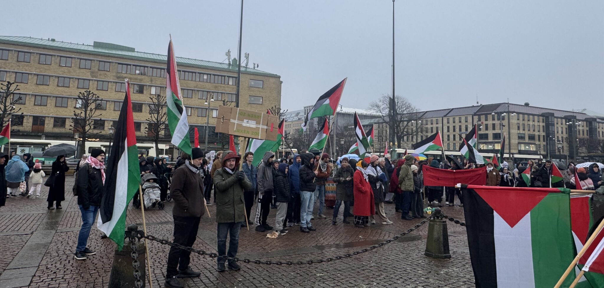 İsveç’in Göteborg kentinde bulunan Gustav Adolf Meydanı’nda her zaman olduğu gibi Filistin ile dayanışma eylemi gerçekleştirildi. Yağmurlu havaya rağmen onlarca kişinin katıldığı eylemde Filistinli kadınlar ve çocuklarla dayanışmaya dikkat çekildi.
