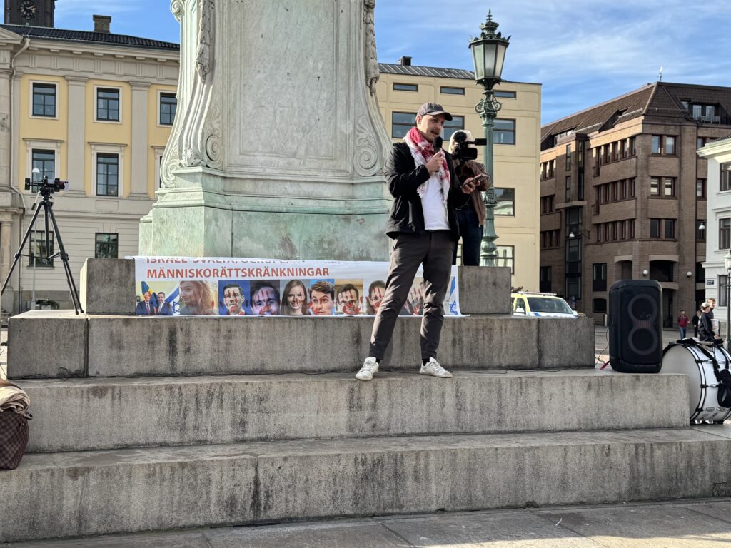 Eylem konuşmalarla açıldı. İlk sözü Samidoun Göteborg grubundan bir temsilci aldı. Konuşmacı, Filistin’de kalıcı bir barışın sağlanmasının önemine dikkat çekerken, bunun ancak tüm Filistinli tutsakların serbest bırakılması ve Filistin’in özgürlüğüne kavuşmasıyla mümkün olacağını vurguladı. Ayrıca “Silahlar susmadıkça Filistin özgür değildir” ifadesiyle süren saldırılara son verilmesi çağrısında bulundu. Konuşmada, Hizbullah’ın, Cephe’nin ve diğer Filistin direniş örgütlerinin terörist olmadıkları, aksine “yoldaşlarımız” oldukları vurgulanan bölüm özellikle alkış aldı.