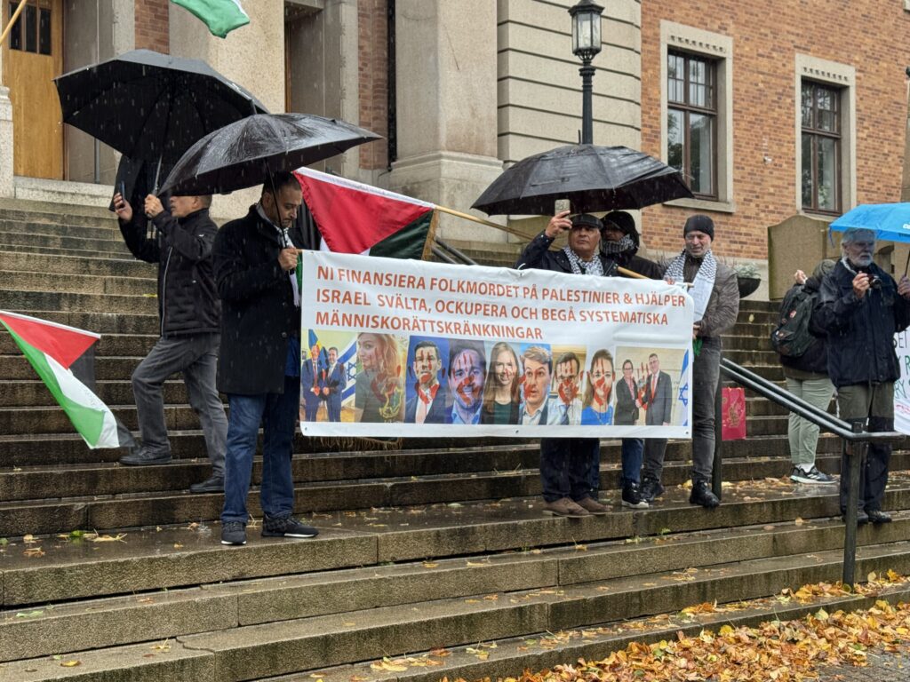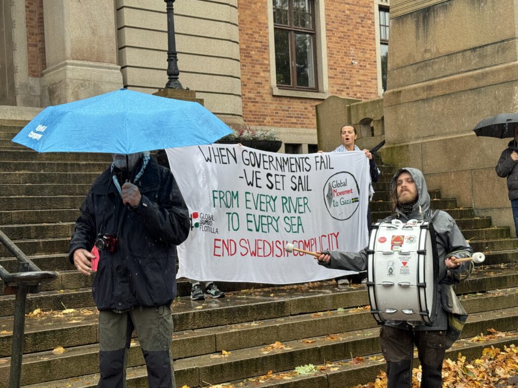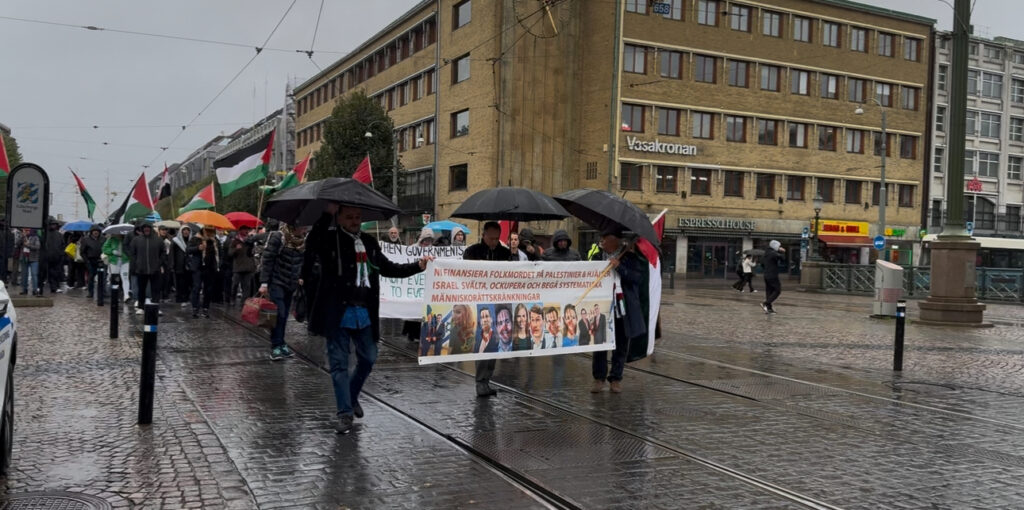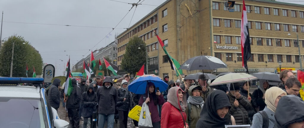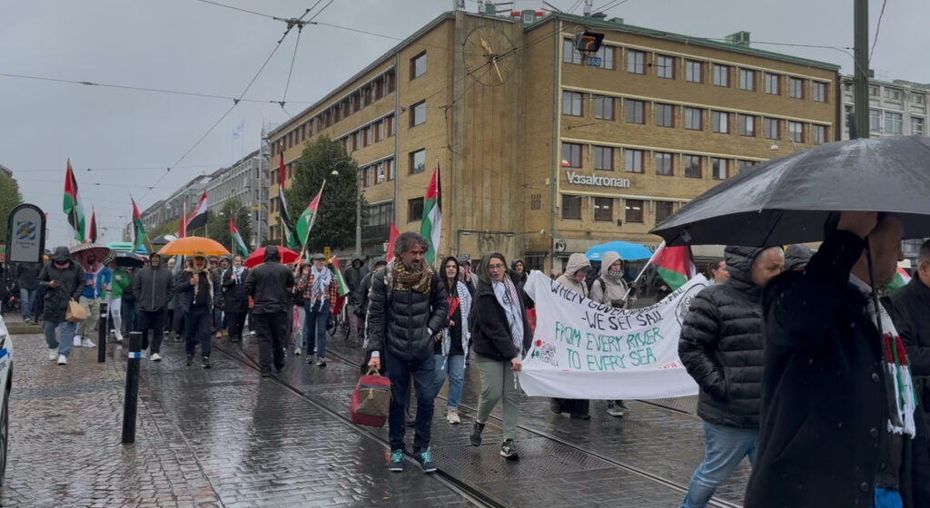 İsveç’in Göteborg kentinde, Gustav Adolfs Torg meydanında saat 14:00’te yüzlerce kişi, İsrail’in yardım gemilerine saldırılarını protesto etmek ve İsrail’de tutuklu bulunan İsveçli aktivistlere destek vermek için bir araya geldi. Yoğun yağmura rağmen katılımın 300’ün üzerinde olduğu görüldü.