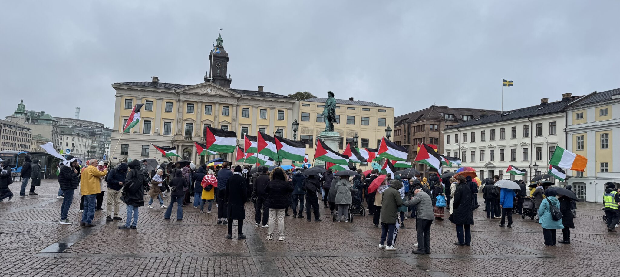 İsveç’in Göteborg kentinde, Gustav Adolfs Torg meydanında saat 14:00’te yüzlerce kişi, İsrail’in yardım gemilerine saldırılarını protesto etmek ve İsrail’de tutuklu bulunan İsveçli aktivistlere destek vermek için bir araya geldi. Yoğun yağmura rağmen katılımın 300’ün üzerinde olduğu görüldü.