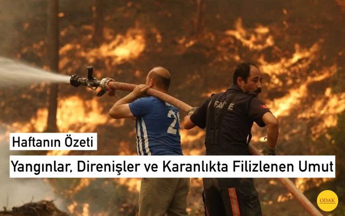 Haftanın özetine Türkiye’deki orman yangınlarıyla başlıyoruz. Eskişehir’deki orman yangınına müdahale eden 5’i orman işçisi ve 5’i AKUT çalışanı olmak üzere 10 kişinin yaşamını kaybetmesi orman yangınlarına karşı neden önlem alınmadığı sorularını yoğunlaştırdı. İktidar kime karşı kullanabileceği belirsiz 40 adet Eurofighter savaş uçağı sipariş ediyor, Kaan savaş uçakları üretimine girişiyor ancak ülkenin hazinesi ormanların yanmasına müdahale edecek uçak temin etmiyor.