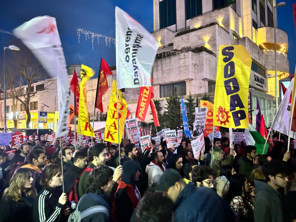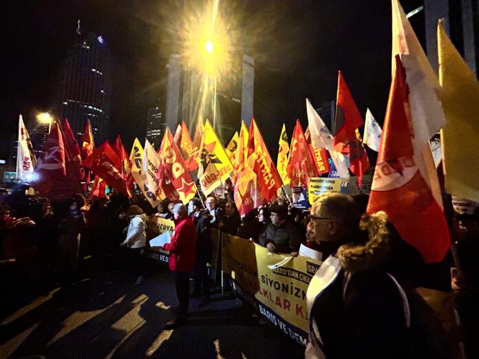 Bugün İstanbul Emek, Barış ve Demokrasi Güçleri, Levent’te bulunan İsrail Konsolosluğu’na yürüyüş gerçekleştirdi. Saat 19:30’da Levent Metro Çarşı çıkışında buluşan kitle, burada sloganlarla yürüyüşe geçti.