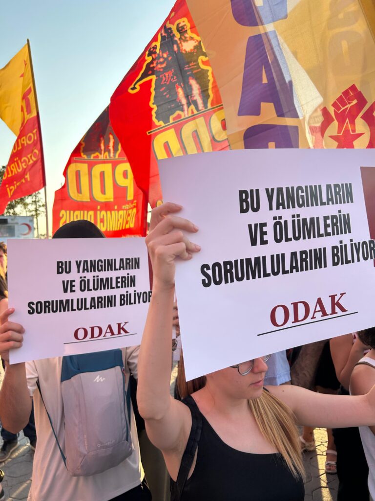 Saat 19:30’da İskele Mehdanı’nda, “Bu yangınların ve ölümlerin sorumlularını biliyoruz” yazılı pankartın ardında toplanan kitle basın açıklaması gerçekleştirdi.