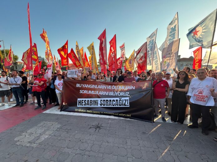 “Memleket her gün yeni bir acıya, yeni bir katliama uyanıyor. Hepimiz, tüm yurttaşlar çok yorulduk, sorumluların cezasızlığından bıktık. Öfkeliyiz…” ifadelerinin yer aldığı açıklamada, “Yangınlara müdahale ederken hayatını kaybeden Hilmi Şahin, Sercan Utni, Tolunay Kocaman, Eyip Dereli, Enes Kızılyel, Muharrem Can, İlker Onarıcı, Tekin Enes Sarıyıldız, Bayram Eren Arslan ve Alperen Özcan’ın ailelerine, sevenlerine ve tüm halkımıza başsağlığı, yaralılara şifa diliyoruz. Can kaybının artmamasını ve yangının en kısa sürede kontrol altına alınmasını diliyoruz” denildi.