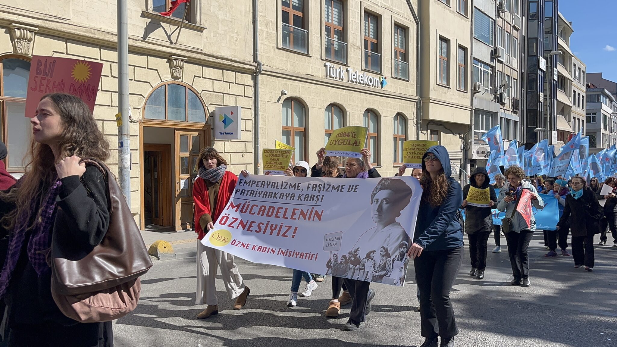 Biz de Özne Kadın İnisiyatifi olarak eyleme katılım sağladık. Kadıköy’de bir araya gelip, emperyalizme karşı direnen kadınlara selam gönderdik. Pankartımızda Rosa Luxemburg ve direnen kadınlar yer alırken, “Emperyalizme, Faşizme, Patriyarkaya Karşı Mücadelenin Öznesiyiz” ifadeleri yazıyordu.