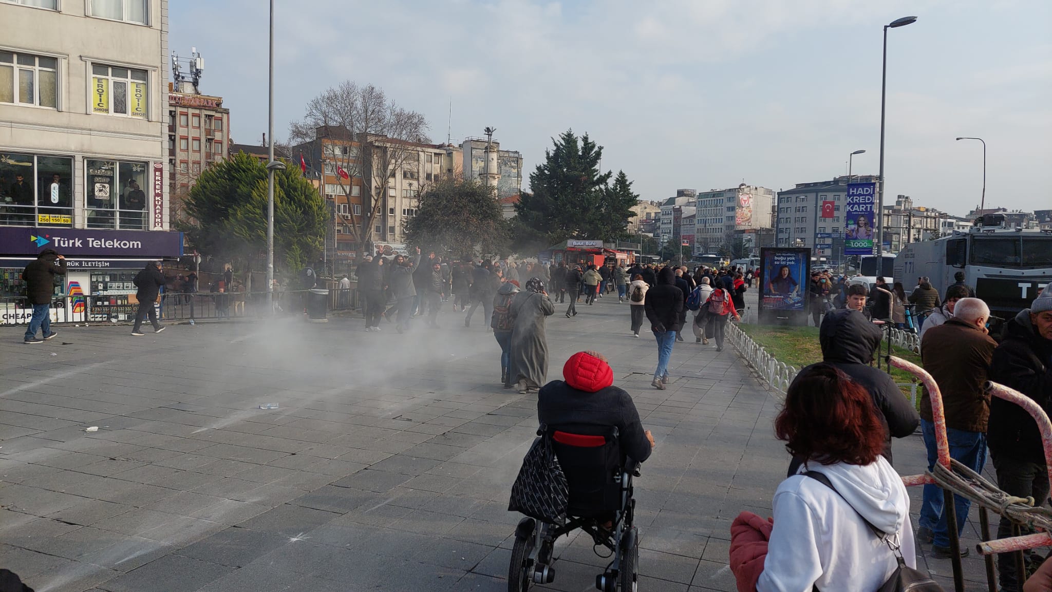 Demokratik Kurumlar Platformu, DEM Parti ve Halkların Demokratik Kongresi’nin (HDK) çağrısı ile Aksaray Meydanı’nda bir araya gelen kitle Saraçhane’ye yürümeye çalıştı. Polisin barikatına karşı direnen kitleye polis biber gazı ile müdahale etti.