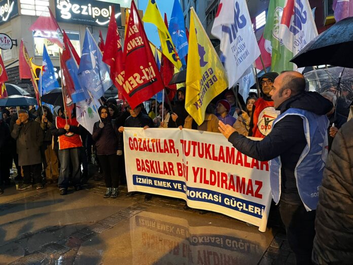 İzmir Emek ve Demokrasi Güçleri ESP ve kurumlarına yapılan operasyonda gözaltına alınan 96 kişi için dayanışma eylemi gerçekleştirdi. Dün saat 18:30’da Türkan Saylan Kültür Merkezi önünde, “Gözaltılar, Tutuklamalar, Baskılar Bizi Yıldıramaz” yazılı pankartı arkasında toplanıldı. Burada basın açıklaması okundu ve kurumların temsilcileri konuşmalar gerçekleştirdi.