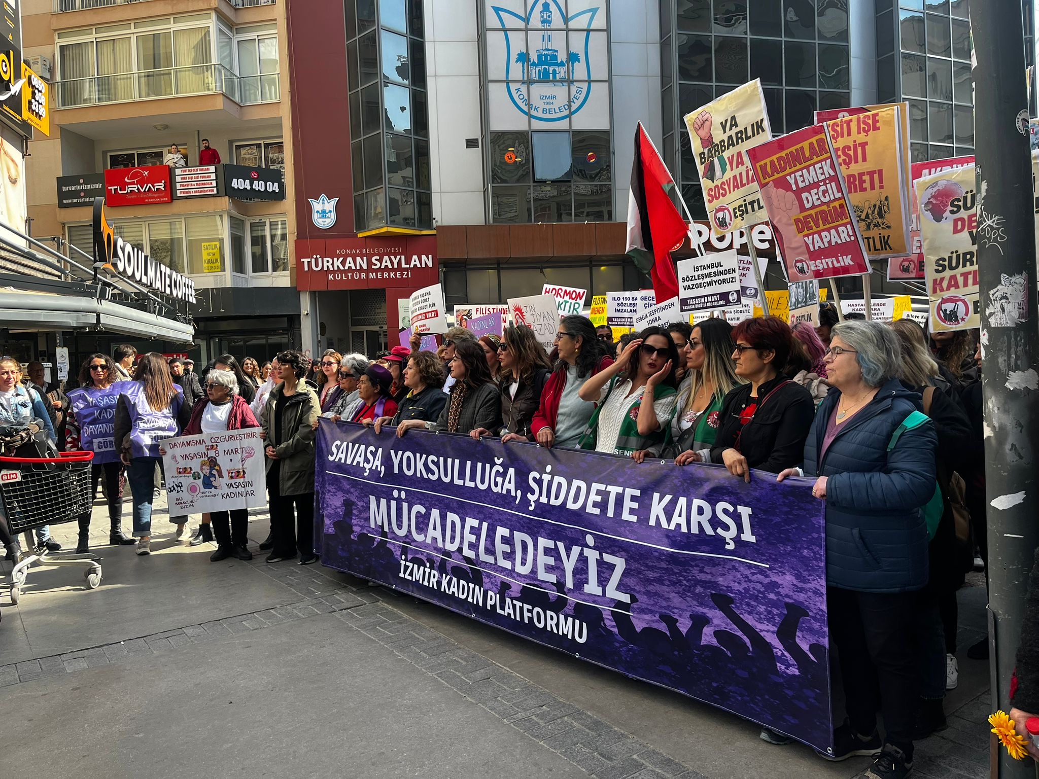 Bugün saat 15.00’de Alsancak Türkan Saylan Kültür Merkezi önünde “Savaşa, yoksulluğa, şiddete karşı mücadeledeyiz!” pankartı arkasında toplanan grup alkışlar, zılgıtlar ve sloganlar eşliğinde Alsancak Penguen Kitabevi önüne yürüdü. Burada basın açıklaması okundu.