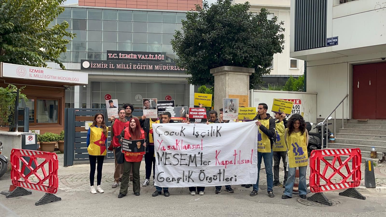 İzmir’de bugün saat 15:00’da gençlik örgütlerinin çağrısıyla çocuk işçi ölümlerine karşı eylem düzenlendi. İl Milli Eğitim önünde toplanan grup, “Çocuk İşçilik Yasaklansın, MESEM’ler Kapatılsın” pankartı açtı.