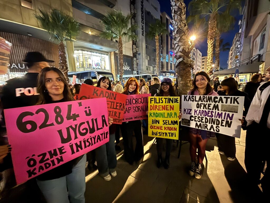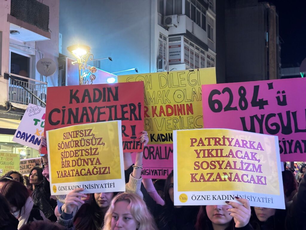 25 Kasım Kadına Yönelik Şiddete Karşı Uluslararası Mücadele Gününde Kadınlar Alsancak’ta, Penguen Kitabevi önünden Türkan Saylan Kültür Merkezi önüne yürüyüş gerçekleştirdi.