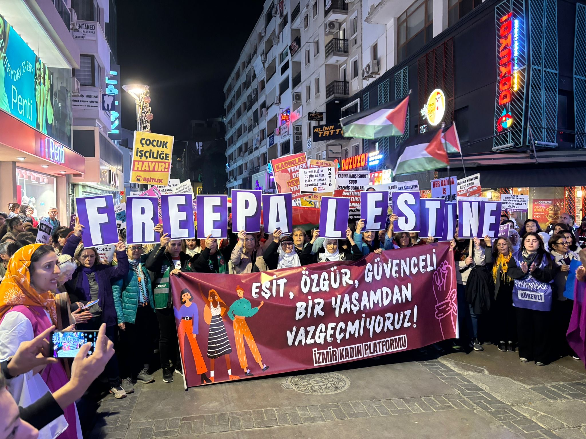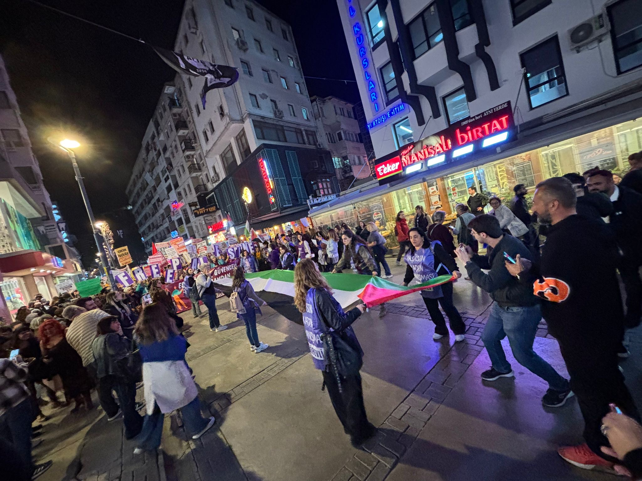 “Eşit, Özgür, Güvenceli Bir Yaşamdan Vazgeçmiyoruz” pankartının arkasına toplanan grup, sloganlar ve zılgıtlar eşliğinde yürüdü. Yürüyüş esnasında Filistin bayrağı ve “FREE PALESTİNE” koreografisi açıldı, şüpheli kadın ölümleri ve 11. Yargı paketi, bütçe konularına değinildi. Ardından TSKM’nin önüne yüründü ve burada basın açıklaması okundu.