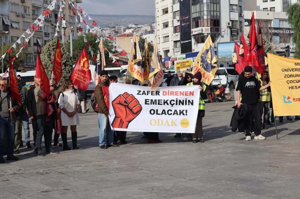 Basın açıklamasının ardından miting, müzik ve halaylar eşliğinde sürdü. Deri Tekstil ve Kundura İşçileri Derneği, DKDER, İşçi-Sen, Kaldıraç, Komünist İşçi Hareketi, Pir Sultan Abdal Bornova Şubesi, KöZ, ODAK, SMF ve Güzeltepe Kadın Dayanışma Derneği’nin örgütleyicisi olduğu miting, “Zafer Direnen Emekçinin Olacak” ile “İşçilerin Birliği Sermayeyi Yenecek” sloganlarıyla sona erdi.