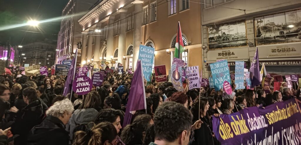25 Kasım Kadına Yönelik Şiddete Karşı Uluslararası Mücadele Günü kapsamında İstanbul’un Taksim’de binlerce kadın bir araya geldi. İstiklal Caddesi’nde toplanan kadınlar, mor bayraklar, dövizler ve sloganlarla şiddete, yoksulluğa ve militarizme karşı ses çıkardı.