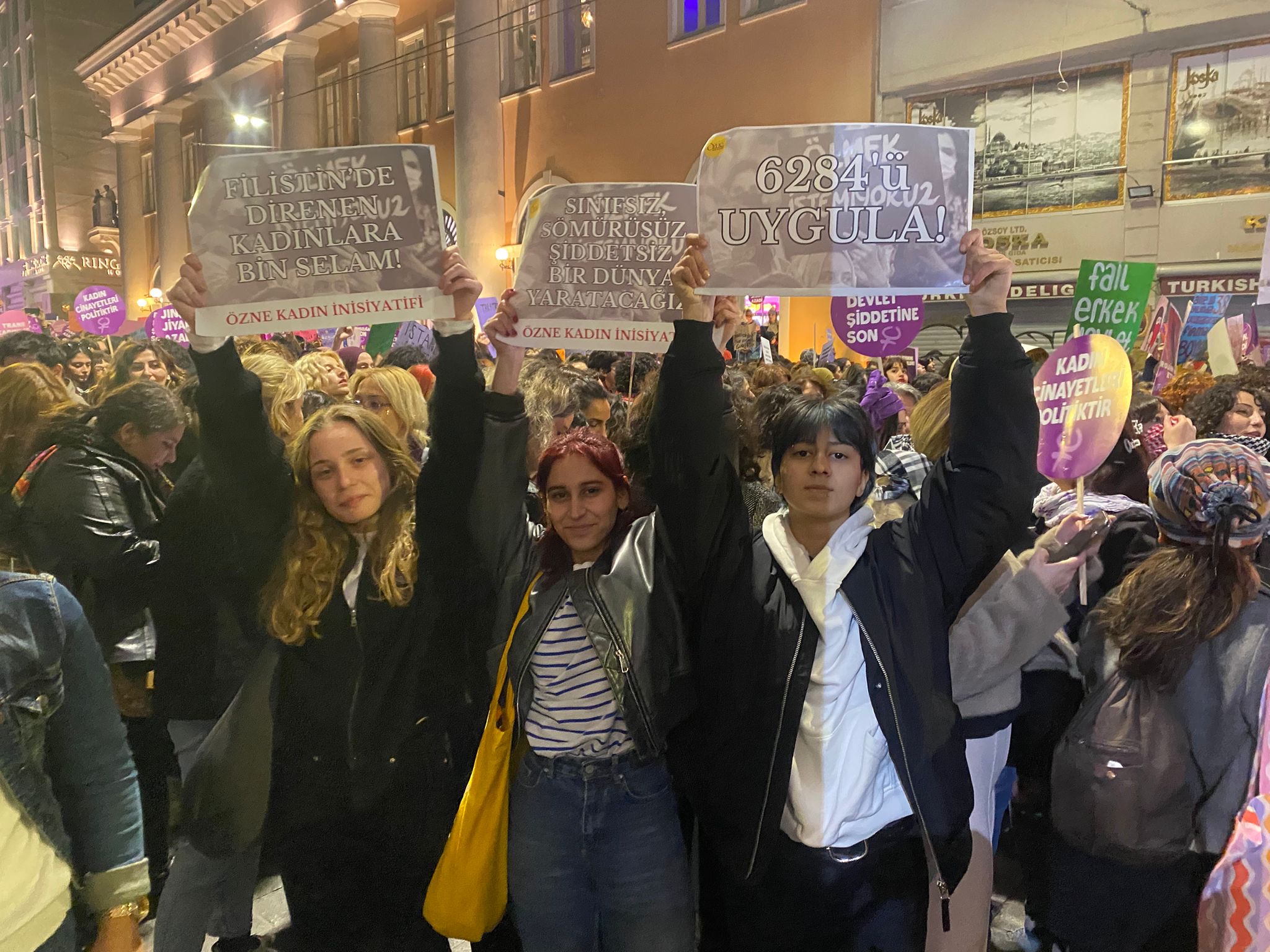 Eylem alanında Filistin bayrağı da taşındı. “Filistin’de direnen kadınlara bin selam” yazılı dövizler ve Filistin’le dayanışma vurgusu yapan pankartlar dikkat çekti. Kadınlar, savaş ve işgal politikalarının en ağır yükünü kadınların ve çocukların taşıdığını vurgulayarak uluslararası dayanışma çağrısı yaptı.
