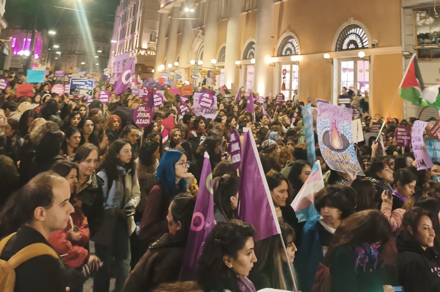 25 Kasım Kadına Yönelik Şiddete Karşı Uluslararası Mücadele Günü kapsamında İstanbul’un Taksim’de binlerce kadın bir araya geldi. İstiklal Caddesi’nde toplanan kadınlar, mor bayraklar, dövizler ve sloganlarla şiddete, yoksulluğa ve militarizme karşı ses çıkardı.