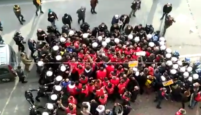 “Valilik kararı olduğu” gerekçesiyle sendika binası önünde oturma eylemi başlatan işçileri çevreleyen polis, bir süre sonra saldırıya geçerek aralarında sendika yöneticileri ve işçilerin de olduğu çok sayıda kişiyi gözaltına aldı.