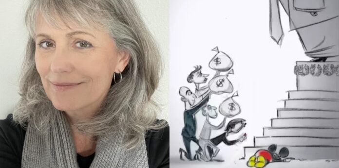 Pulitzer ödüllü karikatürist Telnaes’in taslak çiziminde diz çökmüş milyarderlerin ellerinde para dolu keseleri Trump heykeline takdim ettiği ve Disney’in sembolü Mickey Mouse’un yere kapandığı görülüyor.
