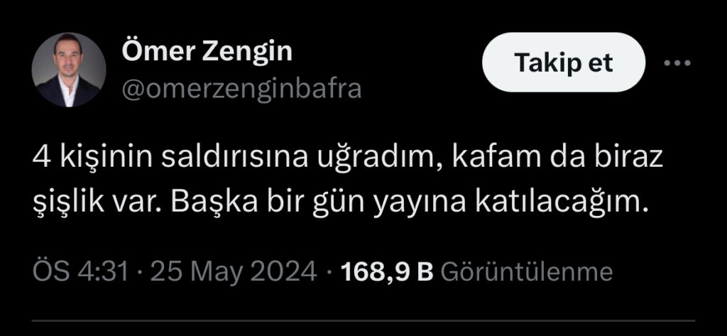 Saldırıyı sosyal medya hesabından saldırıyı duyuran Zengin, şu sözleri kullandı: “4 kişinin saldırısına uğradım, kafam da biraz şişlik var. Başka bir gün yayına katılacağım”