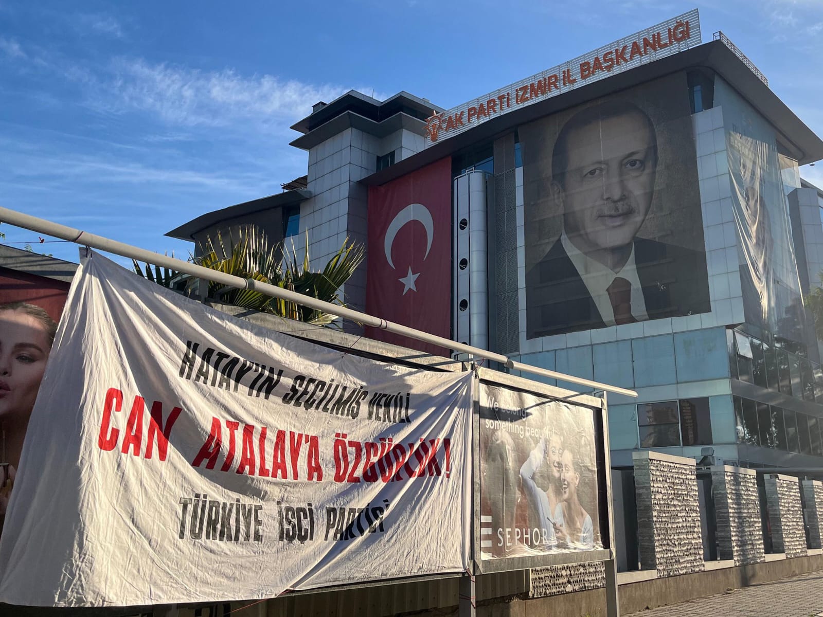 Türkiye İşçi Partisi (TİP) İzmir İl Başkanlığı, 14 Mayıs seçimlerinin birinci yılında Hatay’dan milletvekili seçilmiş olan Can Atalay’ın vekilliğinin düşürülmesine yönelik bir protesto eylemi gerçekleştirdi. AKP İzmir İl Başkanlığı binasının önüne “Hatay’ın seçilmiş vekili Can Atalay’a özgürlük” yazılı bir pankart asıldı.