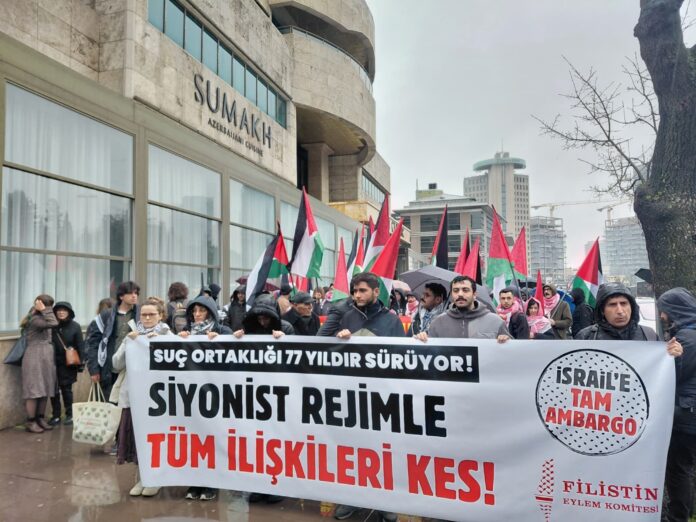 Filistin Eylem Komitesi’nin çağrısıyla Türkiye’nin siyonist İsrail Devleti’ni tanımasının 77. yılında kitle Levent Metro çıkışında bir araya geldi. Bir araya gelen kitle yürüyüş öncesinde sıkça anti-emperyalist ve soykırımı protesto eden sloganlar attı.