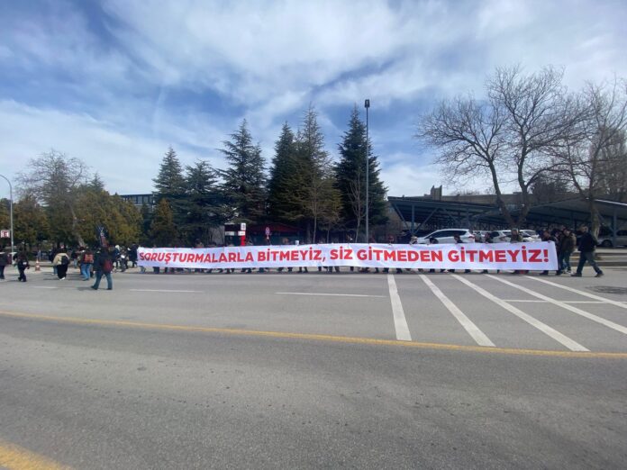 Verilen uzaklaştırma cezalarını ve açılan soruşturmaları protesto eden gençler, “Soruşturmalarla Bitmeyiz, Siz Gitmeden Gitmeyiz!” yazılı pankart açtı. Rektörlük önünde toplanan gençler açtıkları 20 metrelik pankart ile eylemlerini kampüs nizamiye kapısına yürüyerek gerçekleştirdi.